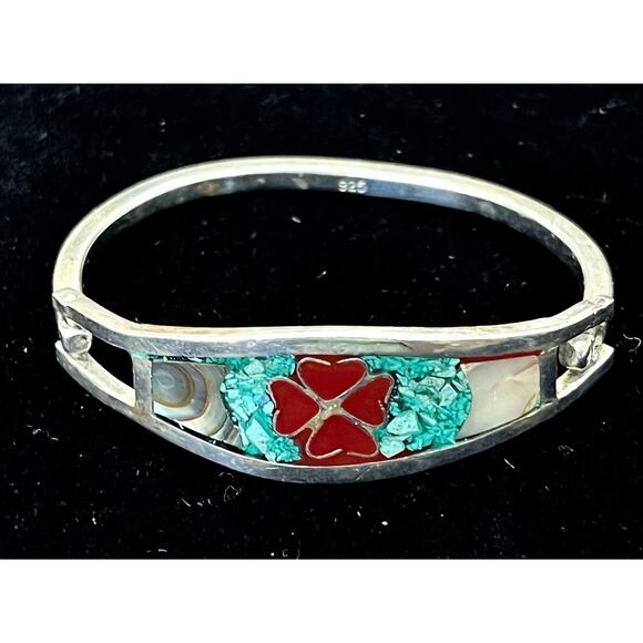 This is a vintage 925 Taxco Mexico Hinged Child Bracelet with Enamel & Abalone. Please see pics with measurements.