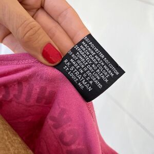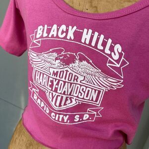 55th Annual Sturgis Rally Harley-Davidson Motor Cycles. Multicolored front graphic featuring an eagle, a dream catcher and other native american inspired designs. The back graphic is all white (has some minor cracking) and features the Harley Logo and says "Black Hills" and "Rapid City, S.D." The shirt itself is a bubblegum pink poly cotton blend with a deep scoop neck in front and back. It has a short cropped cut with two long tails meant for tying up the shirt in front. (2024 is the 84th Sturgis rally so this shirt dates to 1995.) Made in the U.S.A. Single stitch.