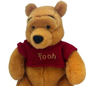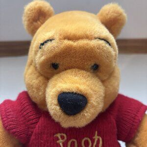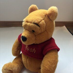 This listing is for a vintage Winnie the Pooh plush toy from 1999. This stuffed animal is approximately 14 inches tall and features Pooh Bear in his signature red sweater with "Pooh" embroidered in gold on the front. It was originally sold at the Disney Store. The plush is in good used condition, with some light wear from age and handling. Please note that the manufacturer's tag is torn. This is a great piece for any Disney or Winnie the Pooh collector.