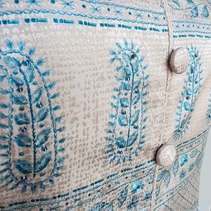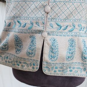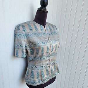 VTG ADRIANNA Papell 100% Silk Jacket Blazer Beige Blue Embroidered Peplum Sz 6