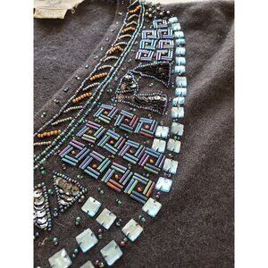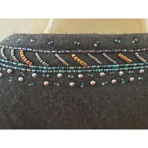 Crafted with a luxurious blend of 70% lambs wool and 20% angora, this vintage Anne Klein sweater offers both warmth and softness. The classic black hue is complemented by a delicate beaded embroidery, adding a touch of elegance to the tight-knit pullover design. Its versatile V-neck style and long straight sleeves make it an ideal choice for any casual occasion throughout the year. Designed to be dry-clean only, this sweater ensures easy maintenance. The sweater is a regular fit and comes in size small, suitable for a variety of body types.