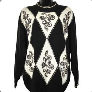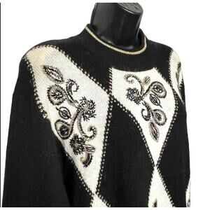 VTG ARGYLE BEADED SWEATER 80s 90s BLACK & CREAM DIAMOND HOLIDAY ALFRED DUNNER 2X