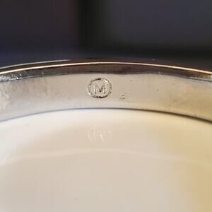 This vintage bangle has abalone inlays and silver tone ram inserts. Signed M and in very good condition.
