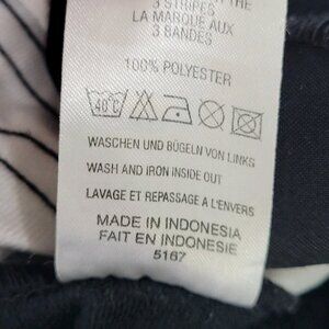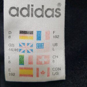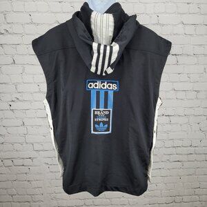 The Adidas Black Removable Hood Snap Sides Sleeveless Full Zip Jacket in size Large features a striped pattern and a short length, making it perfect for travel and casual occasions. This lightweight jacket is made of polyester with embroidered logo accents, adding a touch of retro 90s style. The full zip closure and removable hood with snap sides offer added versatility and functionality, while the pockets provide convenient storage for essentials. Perfect for the summer, fall, and spring seasons, this jacket is machine washable and easy to care for.