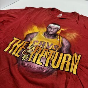 This is a vintage unisex adult red t-shirt made by adidas, featuring a screen print of LeBron James of the Cleveland Cavaliers. The shirt is officially licensed by the National Basketball Association (NBA) and is from the regular season of the 2010s. It is designed for basketball fans and enthusiasts who want to show their support for the Cleveland Cavaliers and LeBron James. The shirt is available in XL size and has a capacity of less than 8 oz.