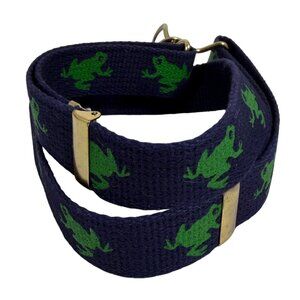 VTG Adjustable Green Frog Patterned Navy On Blue Canvas Belt Brass D-Ring Buckle
