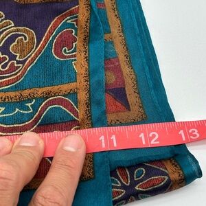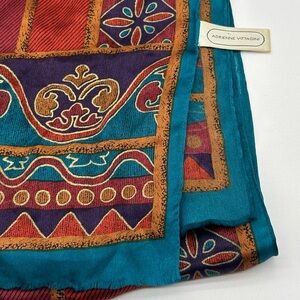 The VTG Adrienne Vittadini 100% Silk Floral Scarf is a vintage piece made in Japan, measuring 11"x53". This multicolor paisley scarf features the brand's logo as accents and is crafted from high-quality silk fabric. The square scarf is designed for women in a colorful and classic style, making it a versatile accessory for all seasons. Its multifunctional design allows for various styling options, adding a touch of elegance to any outfit.