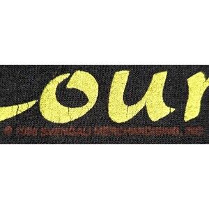 Condition: Fair pre-owned vintage 90s,1997 / 1998 (Front graphic is 1998, back graphic is 1997). 9 Lives World Tour, Aerosmith. Disclosures: The neck is crudely cut into a V-neck shape, the tag was also cut, paint has mild cracking and some distressing to one of the arm pits, all as shown. Otherwise the shirt is in good shape overall. Please view pictures closely for best description. Brand should be either Giant or Tultex