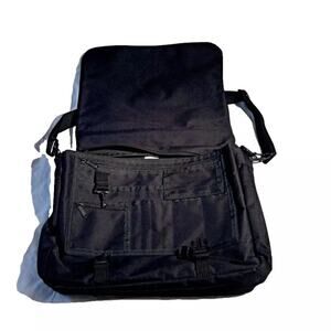 This is a Black Vintage Air Bag brand Cleveland Indians Over-the-shoulder Messenger Bag. It features the team name and the old Chief Wahoo mascot. The bag's main compartment is expandable and it has several small/medium storage pockets. It is not padded, so it is not specifically designed for a laptop, but would easily fit one. No damages or defects. Sold as-is.