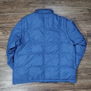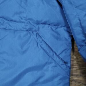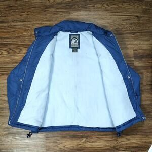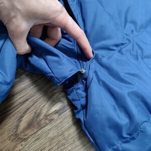 Blue VTG Alaska Frontier winter gorpcore goose down puffer jacket vest, mens size L. It's in good condition, has some tiny burn holes on the front and sleeve