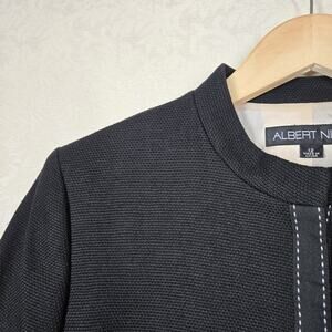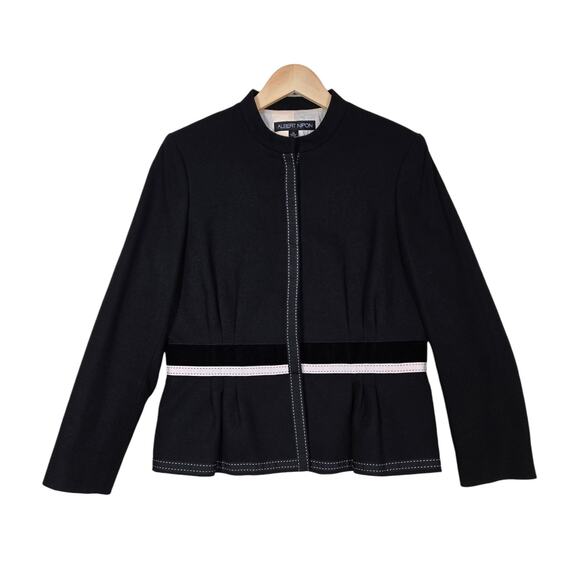 Albert Nipon Suit Jacket sz 12 Black Cotton Snap Front Peplum Hem Velvet Ribbon