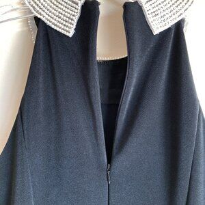 A timeless and sophisticated chic, figure flattering look. Vintage 1990s Alex Evenings Black Sleeveless Cocktail Gown with a beaded halter neckline. Sparkling embellishments adorn the neckline of this elegant evening gown. Darts begin at the bust line to form fitted sleek column silhouette along with some stretch to the fabric.The slit in back allows for easy movement.