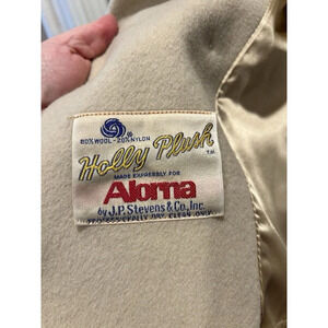 Union made. Excellent vintage condition. No flaws in the wool. Some of the stitching for the collar is loose but its still secure. Pockets. Double breasted. No size tag, measures at a medium.
