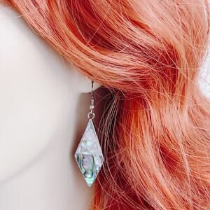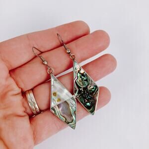 Features: Diamond-shaped dangles; abalone shell inlay; mother of pearl inlay; alpaca silver alloy frame; stamped Alpaca Mexico; French hook wires