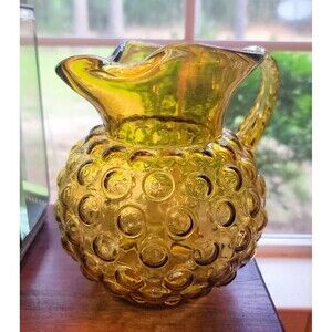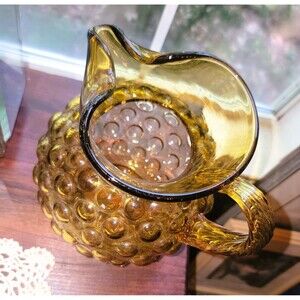 Mint vintage Amber Glass Water Pitcher in the Hobnail Large Dot Bubble Pattern, produced by Fenton, Northwood, Empoli. See Pics. Hand Blown Amber golden brown water pitcher with a Round belly & an applied fancy ribbed handle.