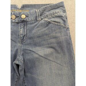 Style/Features: Trouser-style jeans with slant front pockets; mid rise; bootcut leg; double-button waistband with zip fly; V-notch detail at back waistband with "American Eagle" embroidery; welt back pockets with button tabs; AE logo buttons; small embroidered eagle at rear belt area