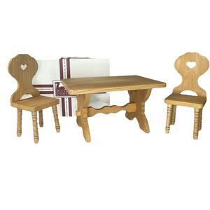 Retired Vintage American Girl Kirsten's Wood TRESTLE TABLE & CHAIRS SET Heart Keyhole Back Seats Rectangle Table Top Retired - Great Condition In Original Box Table Set shows minor signs of wear consistent With 35+ years of age