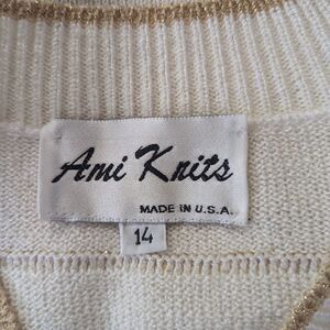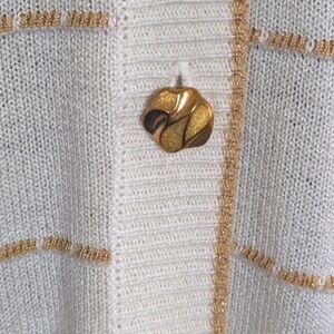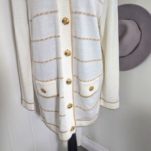 Description: Vintage Ami Knits Cardigan 14 Striped Gold Preppy Nostalgiacore Coastal Grandma, made in the USA, long boyfriend style, sculptural beveled gold buttons along the front and on the two faux front pockets, contrast gold stripes throughout in metallic fabric