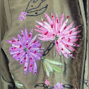 Description: Vintage Anage Green Silk Floral Embroidered Beaded Jacket sz MD EUC, delicate detailed floral designs accented with tiny beads and black jewel accents, beautiful vivid purple lining, pointy collar