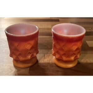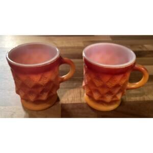 The VTG Anchor Hocking Fire King KIMBERLY Textured Diamond Red Orange Ombre Mugs are a set of two vintage glass mugs with a mid-century modern design. Featuring a textured diamond pattern and a vibrant red-orange color, these round mugs are perfect for all occasions. Made in the United States in the 1960s using a milk glass production style, these mugs are stackable and have an impressed backstamp. With a production technique of fused glass, these mugs are a unique and collectible piece for any home.