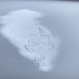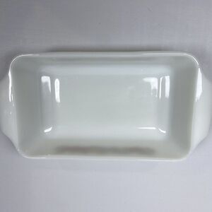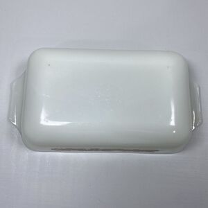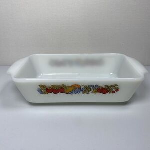 Add a touch of Mid-Century Modern flair to your kitchen with this vintage Anchor Hocking Fire King vegetable and fruit pattern 1 qt. loaf/casserole dish. Made of durable and long-lasting milk glass, this rectangular dish comes in a glossy white finish and is adorned with an impressed backstamp. The dish is oven, microwave, and dishwasher safe, making it a convenient addition to your collection.