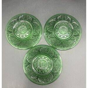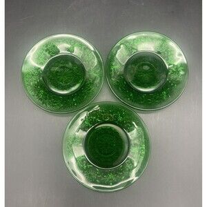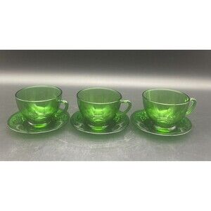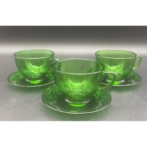VTG Anchor Hocking Forest Green Sandwich Glass Pattern Cups & Saucers Set Of 3.
