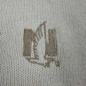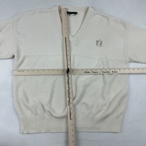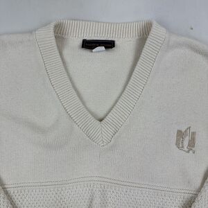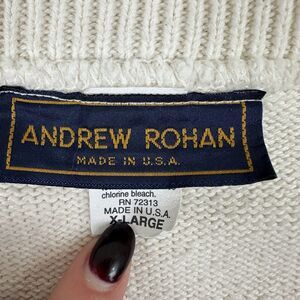 This vintage Andrew Rohan sweater features a cozy cable-knit pattern in ivory color with embroidered logo accents. The pullover style has long sleeves and a v-neckline, and is made of knit cotton fabric that is machine washable. The sweater is a size XL and has a regular fit, making it suitable for travel, party/cocktail, casual, and business occasions.
