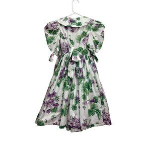 Step into a timeless era with this girls Anne Savoy pastels floral dress. Featuring purple and green blooms, ruffled collar, and tied sleeves, it’s a charming vintage piece. Garden Party