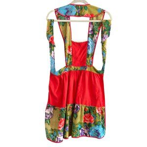 This vintage apron features a charming floral design in red, green, and blue. Perfect for pretend play or baking, it's designed for easy wear with an over-the-head style, ideal for children.