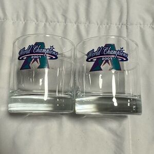 Set of two commemorative Jack Daniel's rocks glasses celebrating the Arizona Diamondbacks' 2001 World Series MLB Baseball victory.
