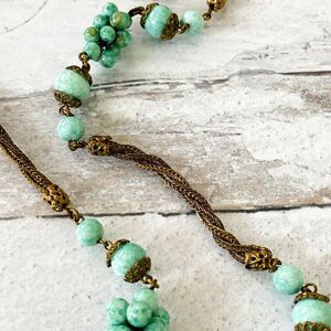 VTG Art Deco Czech Peking Jade Long Flapper Necklace Bead Cluster Stations 35"Lg