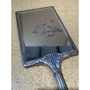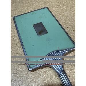Vintage rectangular Art Deco hand mirror with reverse-painted glass back in a soft green tone and a long fluted metal handle. Mirror shows age-related desilvering and wear typical for early 20th-century pieces. No cracks noted. Displays well for vanity décor, theater props, or collection use.