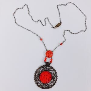 VTG Art Deco Peking Glass Style Red Glass 1920s-1930s Filigree Necklace Pendant