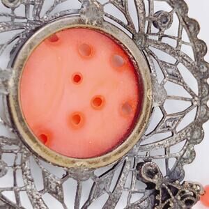 Materials: Molded glass medallions in faux carved coral Peking style; brass filigree; faux seed pearls
