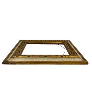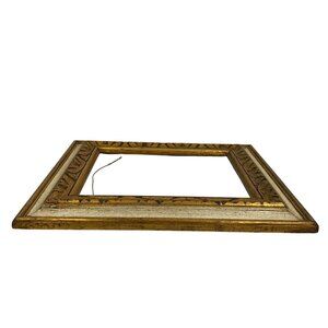 This antique wood picture frame features an ornate gold gilt finish with intricate detailing, ideal for showcasing artwork or photographs. Its vintage charm adds elegance to any decor setting. The frame includes a sturdy hanging wire for easy wall placement.