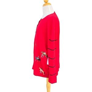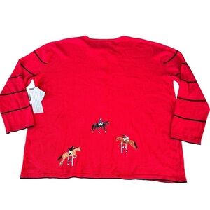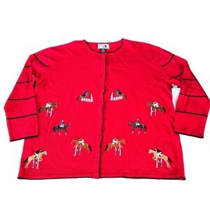 Vintage Equine Artwear Button Front Art-To-Wear Cardigan. Women’s plus size 2X. New Old Stock with original tags attached. Bright Red with Black trim, embroidered equestrian hunter jumpers and dressage horse and riders on the front and back. So kitschy and cute!!