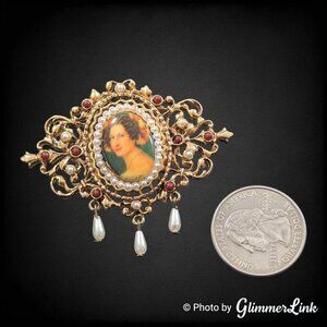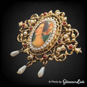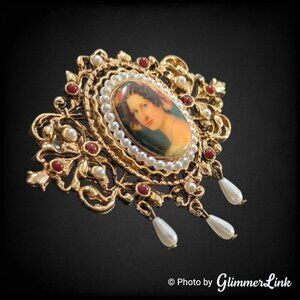 Vintage Arthur Pepper mid century victorian style gold tone filigree cameo brooch featuring a lady portrait at the center. This piece is accented with small maroon red cabochons, seed faux pearls and three teardrop faux pearl dangles.