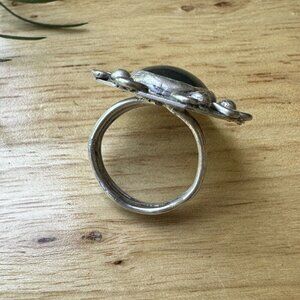This size 5.5 artisan crafted southwestern ring is made of 925 sterling silver with a green and red color bloodstone agate or jasper natural stone cabochon, 9.9 grams precious metal and stone. It is made as a blooming flower with wire petals and domed stud accents along with a 3 into 1 band. This ring has a brutalist character given that the workmanship and shape is free form and overall silver work. Will rate this one as fair to good condition with remnant artisan tooling marks and nuances along with some tarnish oxidation, the stone is in great shape as is the band. Please review the pictures for more details and size measurement information, thank you.