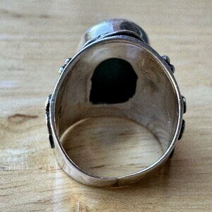This vintage artisan size 5.75 women's ring is a true work of artistry. With a Southwestern ethnic and regional style, it features a beautiful oval-shaped high quality blue turquoise stone with black veins that is sure to catch the eye. The ring is made of purity hallmarked 925 sterling silver weighing 10.4 grams precious metal and stone. Its ornate design and blue color make it a perfect addition to any jewelry collection. The detailed silversmithing was all done by hand and is exceptional with some rawness to it, the style resembles Native American which if we had to speculate this was an anglo artisan inspired by Navajo, Zuni, Hopi or Taxco silversmiths. This artisan handmade ring is in good pre owned clean condition with some minor use or handling wear on the purity hallmarked sterling silver metal, the natural turquoise stone is in excellent condition, no issues. Please review pictures for details and size measurement information, thank you.
