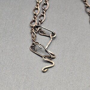 This necklace features vibrant cobalt blue and orange beads in a unique design. The handmade wire chain adds an artistic touch, enhancing its eclectic appeal.