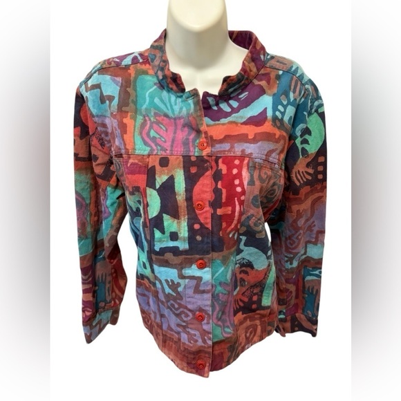 VTG Artsy Boxy Jean Jacket Sz M Colorful Graffiti Print Cotton Pockets Casual
