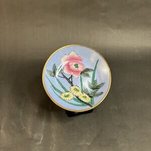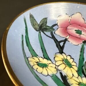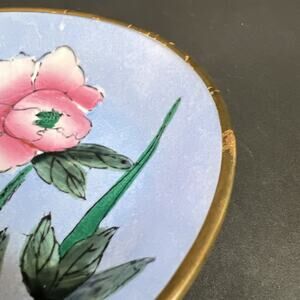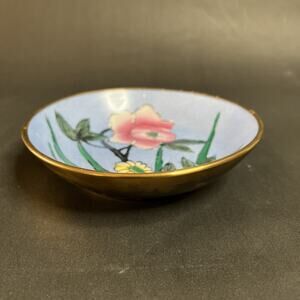 VTG Asian Porcelain Bowl-Bright Blue Glaze,Pink Peony Floral,Brass Wall Decor
