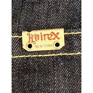Avirex's solid blue jeans for men, size 40x34, offer a vintage Y2K hip hop vibe. With actual measurements of 39.5x33, these wide-leg jeans feature embroidered pockets and are made of 100% cotton. Great pair of 2000's Avirex denim, embroidered Indian, Avi A logo on the back pocket and a Avirex leather patch to belt line.