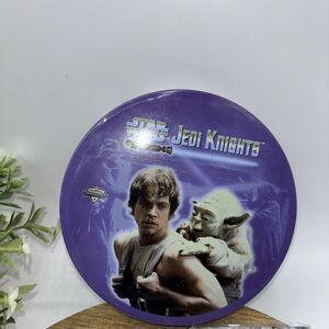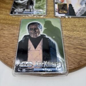 The VTG Avon STAR WARS Jedi Knights Metal Card Set from 1998 features three standard-sized trading cards made of metal, showcasing iconic characters from the Star Wars franchise. The set includes a tin container for storage, adding to its collectible value. These non-sport trading cards are perfect for any Star Wars fan looking to add unique and rare pieces to their collection.