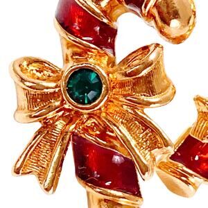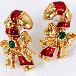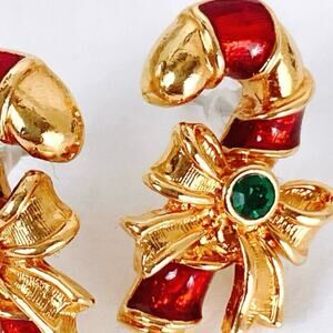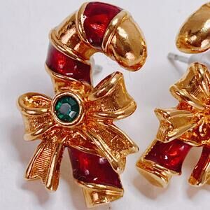VTG Avon Signed Christmas Candy Cane Earrings Gold Tone Red Enamel Green Stone