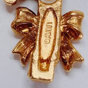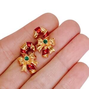 Bring holiday cheer with these signed Avon candy cane earrings, finished in vivid red enamel and gold tone bows accented by green rhinestones. A nostalgic touch of vintage sparkle for the Christmas season.