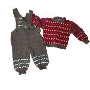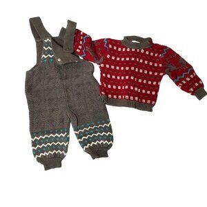 π§Ά This vintage 2-piece toddler set by Baby Claire features a beautifully detailed red knit sweater with reindeer and geometric accents, pearl button closures, and is paired with coordinating gray suspender-style overalls.