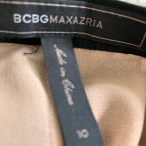 Vintage BCBG skirt has black pleated sheer chiffon overlay with a tan underlining that is visible through chiffon panels. The waist band features a wide lace overlay . Skirt is lightweight and flowy . Is in great condition with no visible snags, tears, staining and is ready to wear . 16 in across waistline 31.50 - 32 in waist , 24 in length .