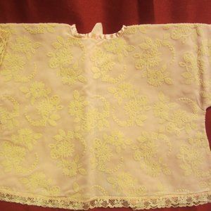 This beautiful handmade vintage baby jacket features a delightful pink and white floral pattern with a lovely white lace overlay. Perfect for any unisex baby or toddler, this shirt jacket has short sleeves and a tie closure. It's a unique addition to any little one's wardrobe and is sure to turn heads. The size is 0-3 months, making it a great gift for new parents or a special outfit for a memorable occasion. This jacket is a true treasure and a must-have for any vintage clothing collector.