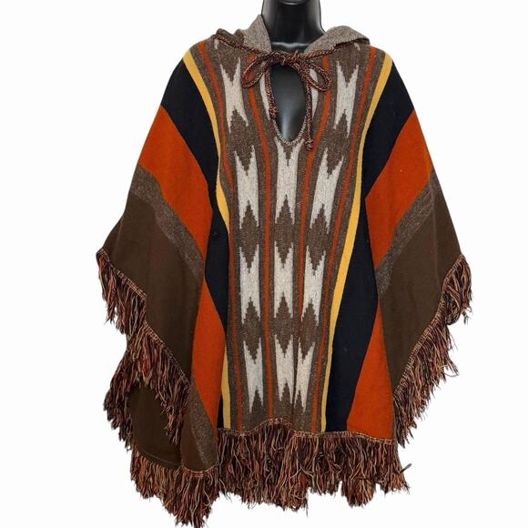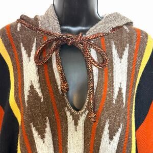 VTG BOHO AZTEC 60s 70s PONCHO HOODED FRINGED WESTERN FESTIVAL CUDDLE KNIT OS